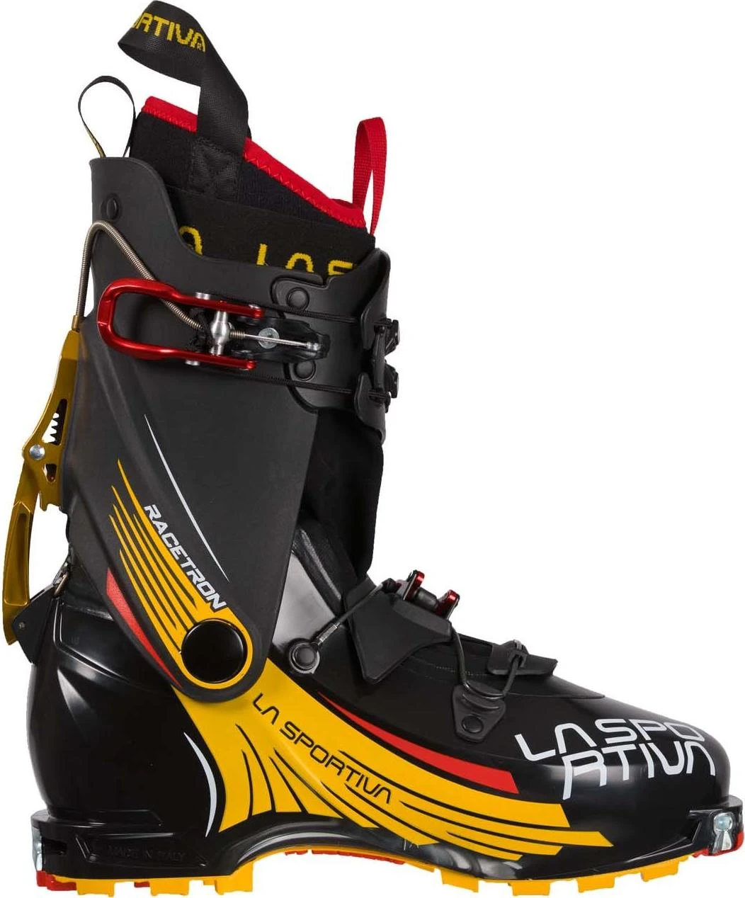 Das Schließsystem mit einem einzigen Hebel und der patentierten CavoBike Lever Pro Mechanismus, ermöglichen das Umschalten von walk auf ski mit nur einer einzigen schnellen Handbewegung, die auch den Schaft freisetzt.Die obere Schuhzunge mit Dreifachregulierung und der untere Spider Ratchet ermöglichen eine maximale Personalisierung des Fits und bieten eine sichere Kraftübertragung während der Abfahrt. Kompatibel mit TECH Bindungen, verwendet er vorne die revolutionäre und patentierte S4 Insert™ Platte, welche das Einsteigen in die Bindung leichter den je macht. Dank der außerordentlichen Beweglichkeit mit garantierter 75° Neigung, und der ISMF kompatiblen La Sportiva RaceGrip™ Sohle, ist Racetron ein schnelles, leistungsfähiges Produkt im Aufstieg und in der Abfahrt und zählt zu den leichtesten seiner Kategorie. Racetron: für eine neue Generation von Champions.