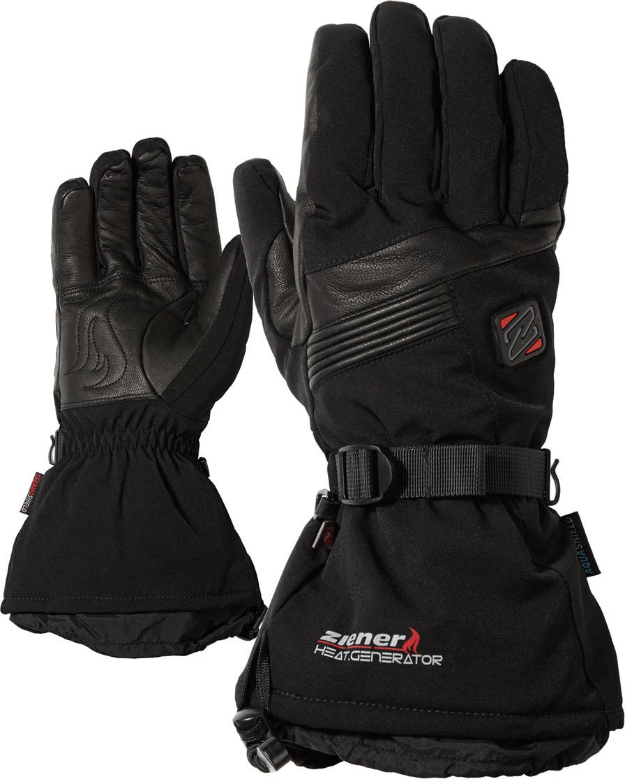 - Die innovativen, beheizbaren ZIENER Skihandschuhe GERMO AS® PR HOT mit einer weichen, robusten Innenhand aus Ziegenleder sind ausgestattet mit der wasser- und winddichten ZIENER AQUASHIELD® Membran. Die Heizfunktion erfolgt über einen kleinen Akku, der sicher und komfortabel in einer Tasche auf der Innenseite der Handschuhstulpe verstaut werden kann. Die Komfortzone von 37-40 Grad im Handschuh wird je nach Außentemperatur durch drei verschiedene Heizstufen erreicht. Somit ist eine optimale Wärmeregulierung garantiert. Eine zusätzliche, besonders warme PrimaLoft® Gold Wattierung hält die Hände auch bei niedriger Stufe bis zu 8 Stunden angenehm warm. Bei höchster Stufe heizt der Akku dem Skifahrer bis zu 4 Stunden ein. Die lange Stulpe wird mit Hilfe einer Leiterschnalle fixiert und kann dank Cordlock-System mit nur einer Hand fest ans Handgelenk gezogen werden. Das Produkt enthält recyceltes Material – für einen ressourcenschonenden Umgang mit der Umwelt. Enthält nichttextile Teile tierischen Ursprungs.
